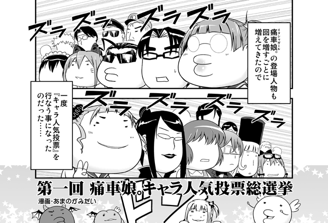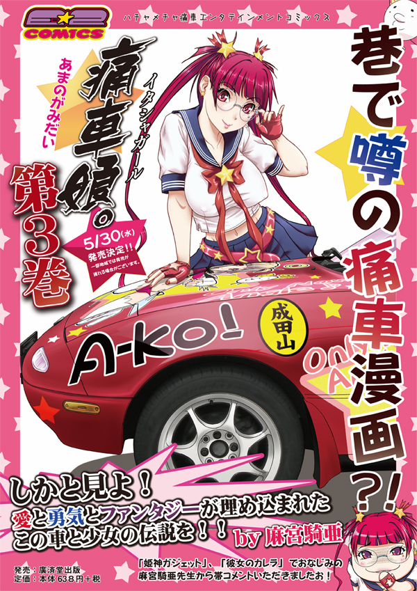最初はオフ本を2冊作って2冊買ってくれた方のみICカードサービスなどと考えていたのですが オフ本の一冊は間に合わない上、ICカードステッカーは原価が高いので、 1冊ではとてもおまけできない価格なのです… よってコピー本との抱き合わせ販売のみになります どうもアコギですいません…(╯⊙ ⊱ ⊙╰ ) AKB0048本は少ないと思うのでファンの人は遊びに来てねーん三└(┐卍´◔3◔)卍 AB∞48 これで「アイドルバスターフォーティーエイト」と読む(笑) アイドルなら「i」なのではというツッコミは受け付けないぞ!(╯⊙ ⊱ ⊙╰ ) AKB0048候補生オールキャラ男性向け18禁本です。 コミケスペースは31日(月) 東E-15a 1期の放送やニコ生の一挙放送を観て面白かった人はきっといるはず…なのに コミケの新刊を色々なところで検索してみても、 AKB0048の本は数少なくかつ、エロといったらうちの所しか 引っかかりませんでした…(;΄◉ 3 ◉‵) コピー本も準備中なので星を越えて会いに来てよねーん三└(┐卍´◔3◔)卍 会場に来れない人は書店の販売も始まってまーす。 とらのあな メロンブックス まんだらけ MAGMAG ZIN 同人堂 ブックメイト グレップ サンプルは右下の続きをクリック! どもども;更新少なくてご無沙汰です;あまのがみだいです 少し前のE☆2で行われた、痛車娘。のキャラ人気投票の結果が出ました! イイニイハイの日(11月28日)に便乗して本日E☆2の公式サイトでweb漫画にて公開! http://www.etsu.jp/comics/itashaGirl/ 注目の結果をどうぞご覧あれ~ 本編も『暗黒痛車軍団(仮)編』に突入して依然連載中です! Σ⌒(☆◯3◯)⌒シクヨロ!! E☆2で連載中のハチャメチャ痛車エンタテイメント漫画 痛車娘。(イタシャガール) ついに第3巻発売です!(*上画像は宣伝用のポスターイラストです) 今回帯の推薦文を、『姫神ガジェット』『彼女のカレラ』等車漫画でお馴染みの、な、なんと 麻宮騎亜先 が書いてくれました!ひょぇぇ;恐縮すぎるぅぅ;(((;゜3゜))) 今回の新登場車種も MR2、プリウス、京浜東北線E233系、山手線E231系、東京メトロ南北線9000系、丸ノ内線02系、中央総武線E231系、AZ-1、ビート、カプチーノと、バラエティ豊か!! ・・・うん?電車?電車が混じってる・・・??そうです、なんと今回はなんと都内近郊の電車ともバトちゃいます!! どの話も取材は大変ですが、特に電車の回は大変でした(電車止まってくれないし;)が、今までのアンケートでも一番反響があった回でもあります。沢山修正や加筆も加えたので、雑誌で読んでくれた人も、単行本派の人も楽しんでもらえたら嬉しいです\(*´3`)/ それとブログの→欄で痛車娘。のキャラクターの人気アンケートをとっております(次回雑誌でも募集する予定です。スマホの人はこのまま一番下の記事続きのクリックからも投票できます) 1巻~3巻までの登場キャラ(主にドライバー)に投票できます。出ていないその他のキャラも【回答追加】で増やしてもOKです!お気に入りのキャラに一票投じていただけると嬉しいです。(現在重複投稿は出来ませんのご注意ください) 今後の痛車娘。の作品展開の参考にさせて頂きます!あと漫画以外のアレにもゴニョゴニョしてくるかもしれませんのでどうぞシクヨロ!! 秋葉原で公道バトル!ガソリン気にしたエコバトル!!電車と痛車の異色バトル!!こんな車漫画が読めるのは痛車娘。だけっ!! どうなる英子ちゃん!どうなる秋葉原!? Σ⌒(☆◯3◯)⌒<「全員まとめて受けて立つお!」 ハチャメチャ痛車エンタテイメントコミックス第3弾! 英子は再び、思い出の痛車乗りに出遭う事はできるのか・・・? 5月30日発売!